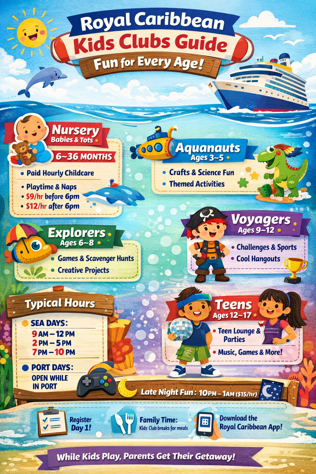 Download the Royal Caribbean app and check youth programming once onboard (hours can shift by itinerary).