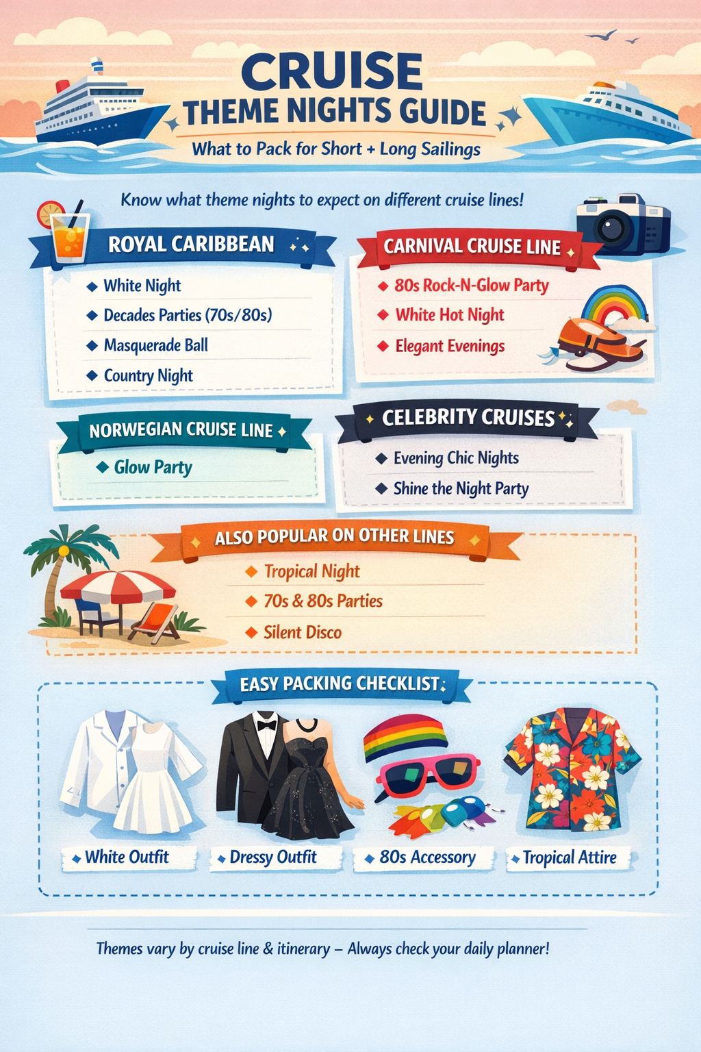 💡 Pro Tip: If you only pack for ONE theme across most lines, pack one white outfit (it’s commonly used for White/Glow parties). (Norwegian Cruise Line)