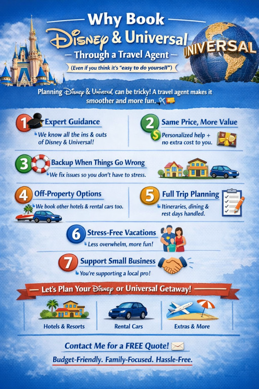 Translation: We can design a Disney/Universal trip that fits your budget even when staying off property—without you juggling 10 confirmations.