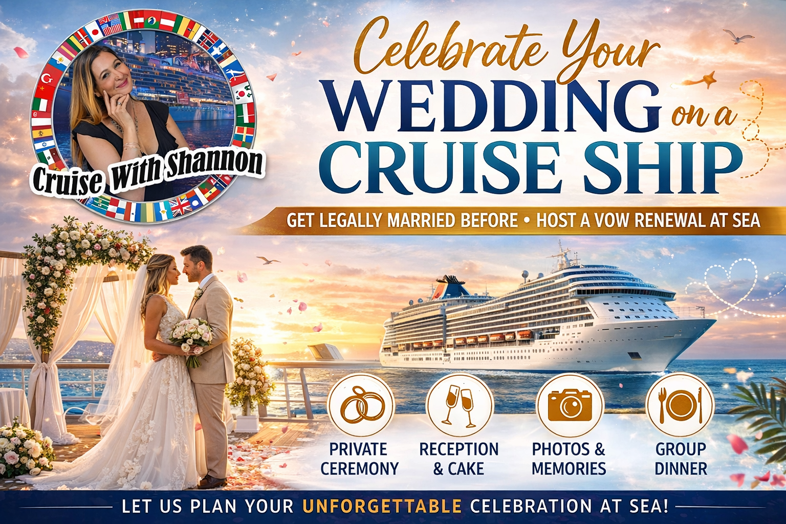 “Couples who want to celebrate their wedding on a cruise ship often choose to get legally married before sailing, then enjoy a beautiful onboard vow renewal ceremony that looks and feels like a real wedding celebration. They can reserve a private room for the ceremony and reception, enjoy photos, cake, and champagne, and have their family and friends linked together for main dining that evening.”